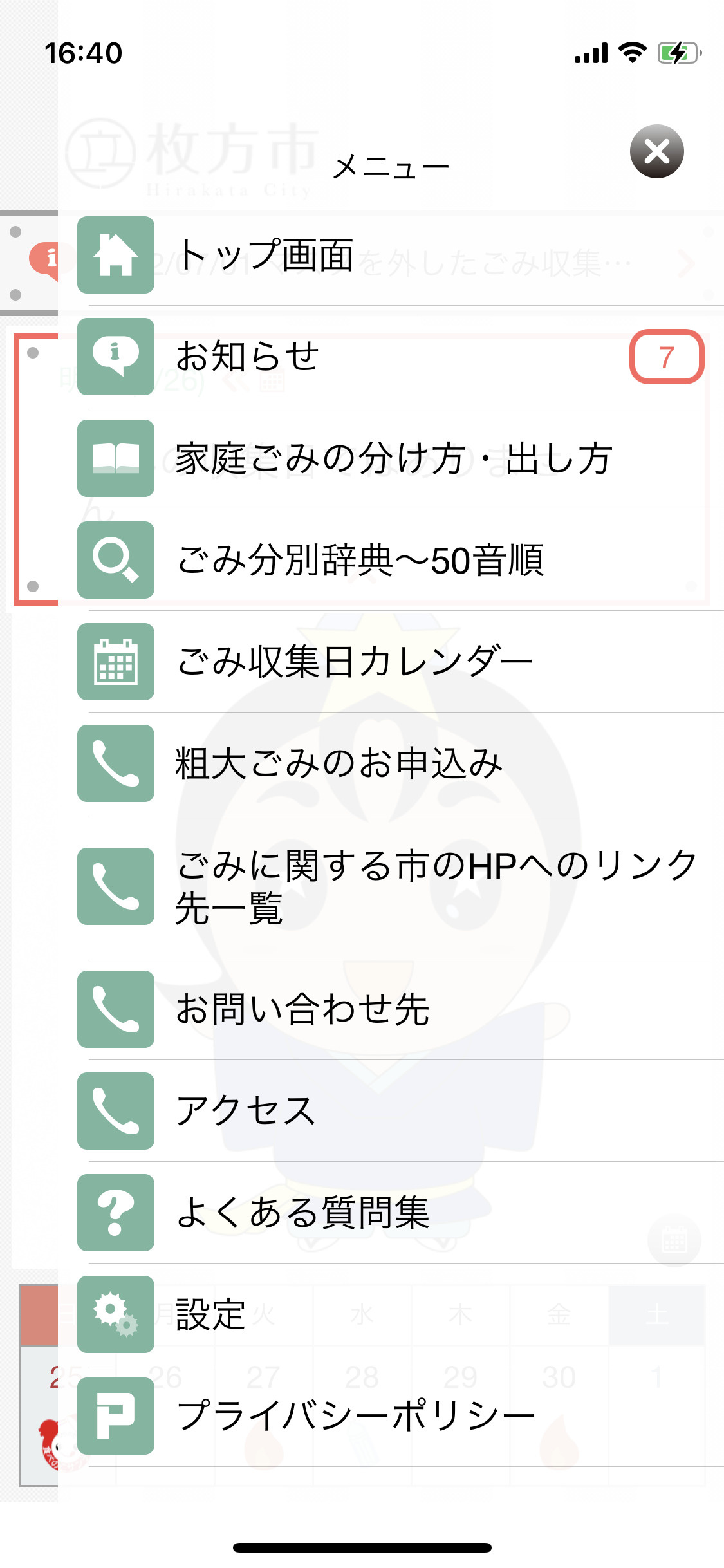 粗大ゴミの申込、めちゃくちゃ便利な分別辞典などのメニューは