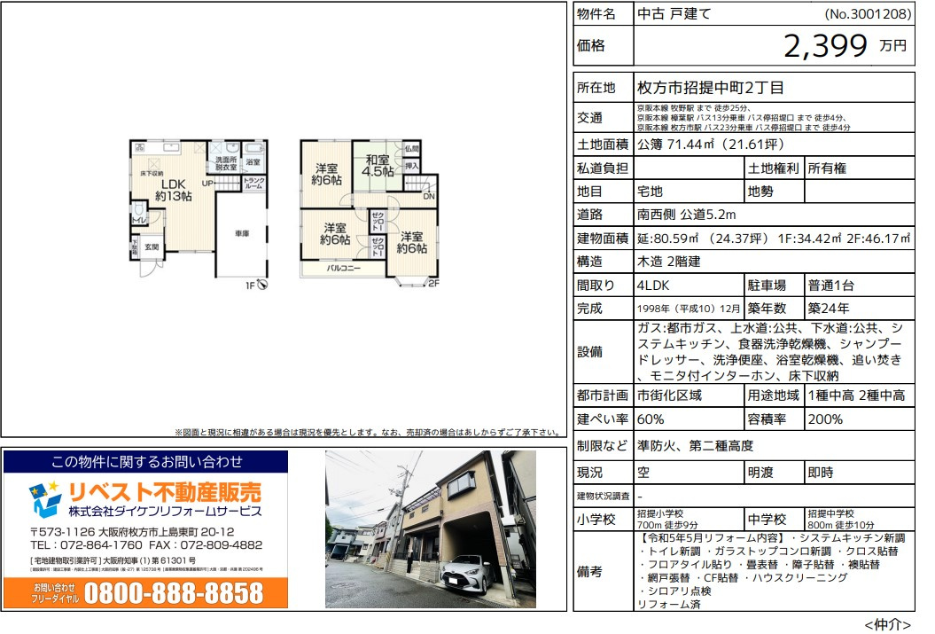 ■枚方市招堤中町2丁目 2,399万円 中古戸建(リフォーム済)