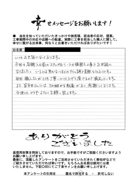 いつもお世話になっております。 今回も店舗入口前のステップ台シートの張替え工事でお世話になりました。シートとは思えないほどのタイル調で素敵な仕上りです。 毎回、職人さんがとても丁寧に仕上げて頂けるので満足しています。 また、笠牟田さんには、きめ細かな配慮があり、感謝しております。 今後ともどうぞよろしくお願い致します。